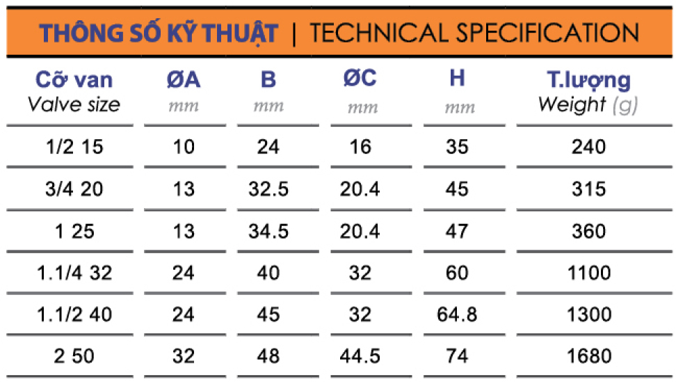 Van phao, nối ren, mạ crom hoặc không mạ crom.